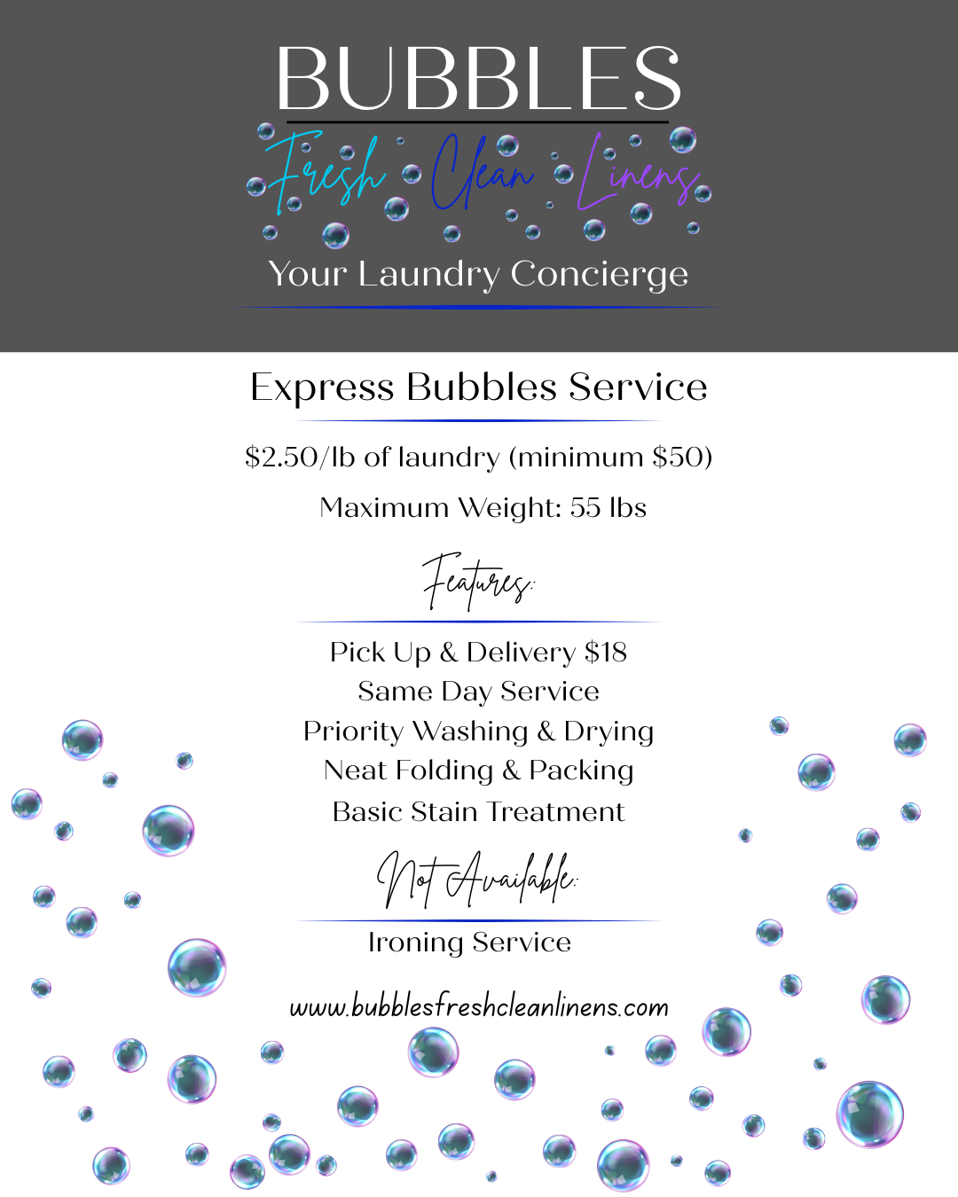 If you are looking to take a load off your shoulders, then you've come to the right place! Here at Bubbles | Fresh Clean Linens we are your Laundry Concierge. We offer the following: FREE Pickup & Delivery, Standard or Express Wash, Dry, Fold and Recurring Service Set Up.